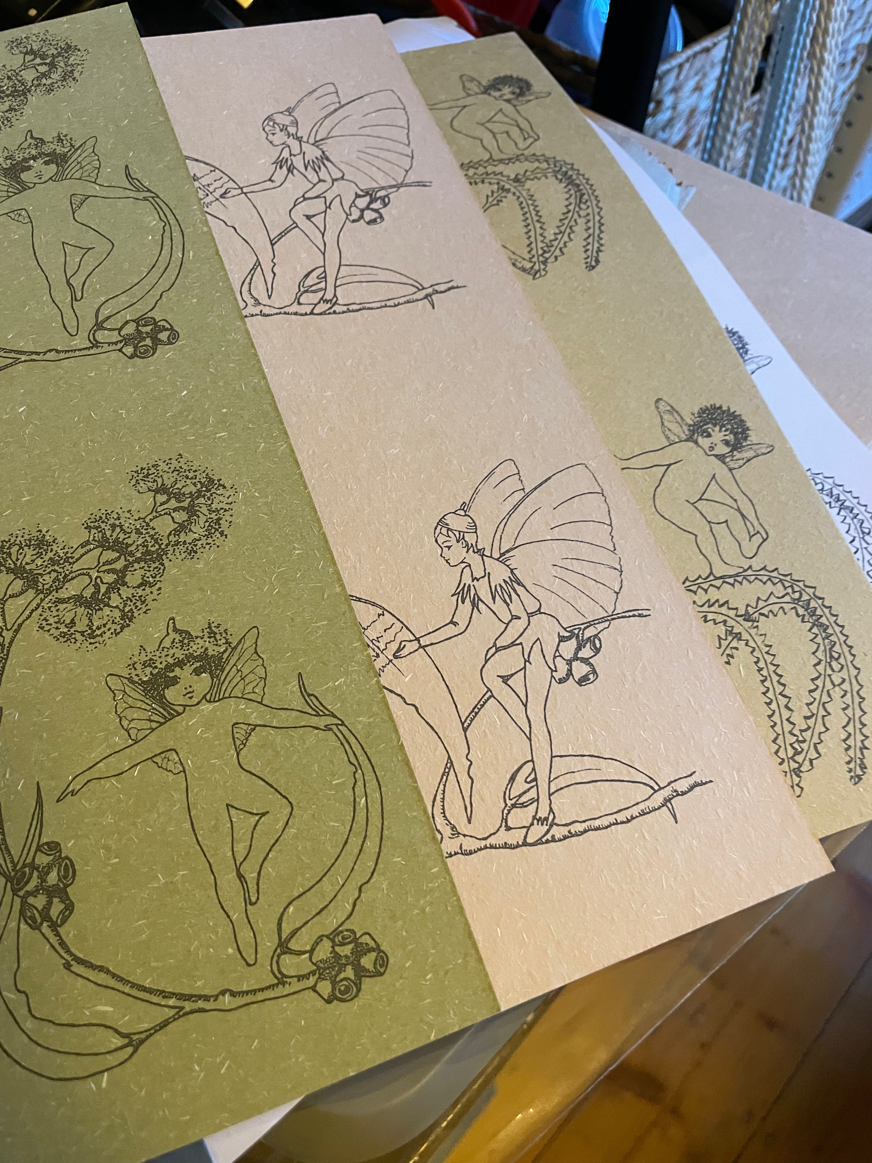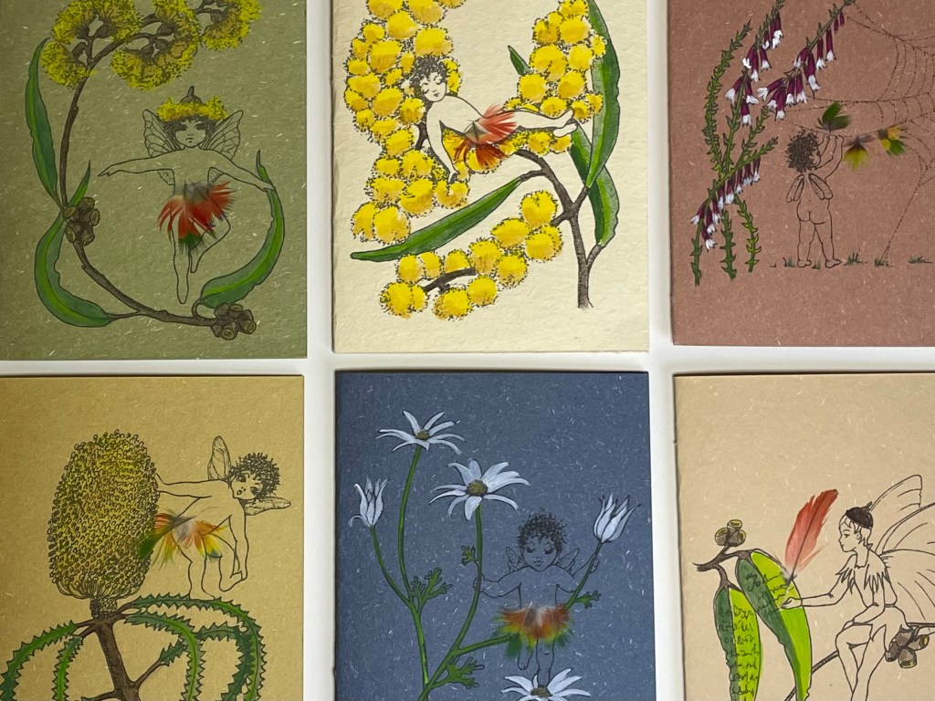 All items are hand made using our own artist original designs. Australian Bush Fairies are made with 100% Australian recycled card, paper and envelopes. We use ethically sourced materials, and celebrate the textural earthy and organic qualities. Each work is carefully hand painted and unique.