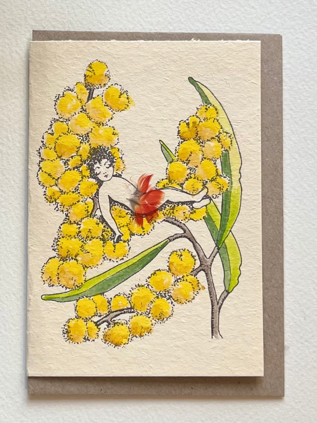Hello! I’m Goldie the Golden Wattle Fairy. I look after the beautiful blooming wattle shrubs and trees. So many bugs and bees and birds come to my wattle when its flowering, it’s a huge community of activity in late winter and early spring when the weather is starting to warm and everyone is getting excited for spring! I’m so busy during flowering season sometimes I just have to take a little nap on the soft yellow puffs of wattle. Next time you pass a beautiful wattle tree in bloom maybe you will catch a glimpse of me sleeping there!