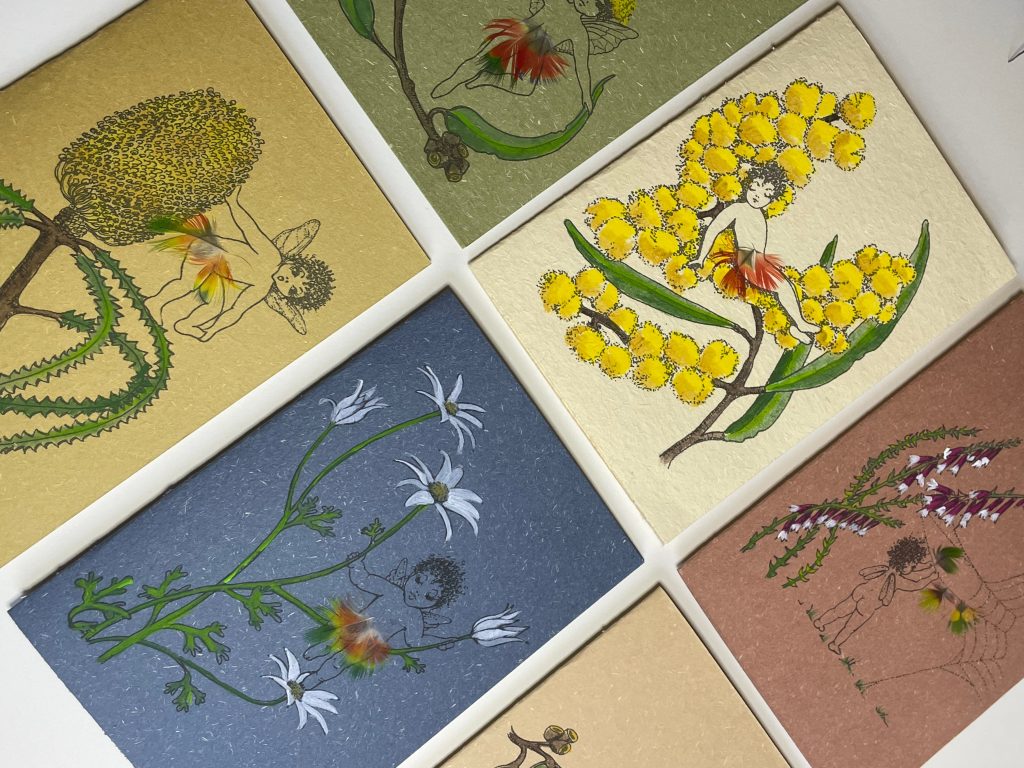 The Australian Bush Fairies Collection are available as hand painted cards, hand-painted prints (A5 and A4), or as a monthly fairy subscription.